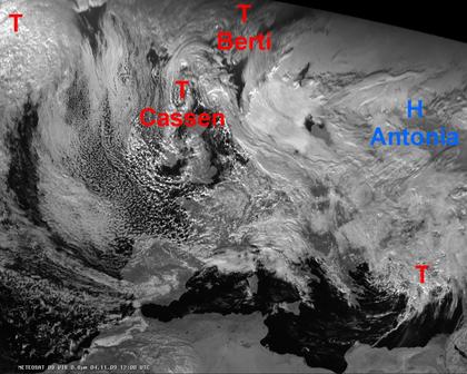 Auf dem Satellitenfoto von heute Nachmittag zeigt sich Europa verbreitet unter teils dichten Wolken. Vor allem in West- und Mitteleuropa kommt es häufig zu Schauern, gebietsweise auch zu kurzen Gewittern. Auch in Südosteuropa sorgt ein kräftiges Tief für häufige Schauer und teils kräftige Gewitter. Nach Norden hin fällt zeitweise etwas Schnee. Dagegen sorgt Hoch 'Antonia' über Westrussland für meist trockenes, meist aber auch für trübes Wetter.