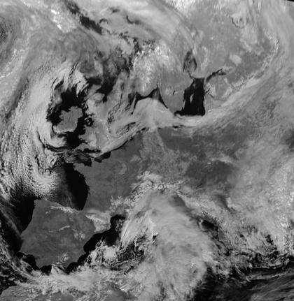 Unter vorherrschendem Hochdruckeinfluss und meist trockener (aber auch kalter) Luft findet man über Europa viele wolkenarme Gebiete. Dichtere Wolken liegen im Bereich von Tiefdruckgebieten über Italien und Südosteuropa. Aber auch von Ostengland über die Nordsee, Schleswig-Holstein und Dänemark bis zur südlichen Ostsee hält sich bei etwas feuchterer Luft hochnebelartige Bewölkung. Weiterhin sind über Deutschland die schneebedeckten Gebiete gut zu erkennen.