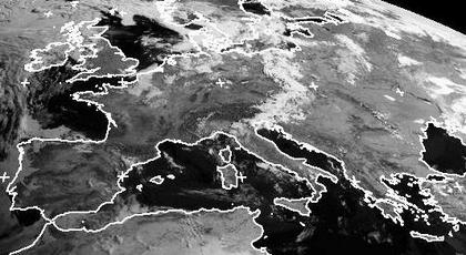 Auf dem Satellitenbild von Montag früh ist ein Wolkenband von Polen über Tschechien bis nach Norditalien gut zu erkennen. Hier entwickeln sich heute im Laufe des Tages örtlich Schauer und Gewitter. Ein kleines Tief über Südnorwegen sorgt in Südskandinavien und Norddeutschland noch für Wolken, Regen fällt aber kaum. Sonst sind über Europa kaum Wolken zu erkennen.