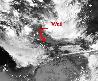Östlich von Australien, auf Höhe von Neukaledonien hat sich der Wirbelsturm 'Wati' aufgewirbelt. Zur Zeit erreicht er Windgeschwindigkeiten von 130, in Böen 158 km/h und zieht Richtung Westen auf die Australische Küste zu. Berechnungen zufolge soll er sich noch verstärken, aber noch vor der Australischen Küste nach Süden abdrehen.