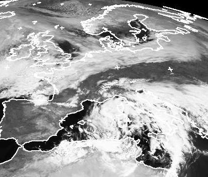 Ein Tief liegt über Italien und bringt von Nordafrika bis nach Südosteuropa bei kalter Luft viel Regen, teils mit Gewittern. Weiter im Norden ziehen von Westen eher schwächere Tiefausläufer durch. Dazwischen liegt ein Gebiet mit höherem Luftdruck. Über Deutschland zeichnet sich eine deutliche Grenze ab, bis wohin die feuchte wolkenreiche Luft sich von Nordwesten schon ausbreiten konnte. (Bildquelle: NERC Satellite Receiving Station, Dundee University, Scotland, http://www.sat.dundee.ac.uk/)