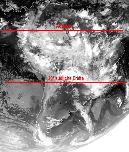 Auf dem heutigen Satellitenfoto zeigen sich besonders viele und dichte Wolken auf dem südamerikanischen Kontinent zwischen dem Äquator und dem 20. südlichen Breitengrad. Zur Zeit des Südsommers verlagert sich typischerweise die Wokenbildungs- und Schauertätigkeitzone besonders auf den Kontinenten teils weit nach Süden. Im Bereich südlich des 20. Breitengrades, in diesem Fall über Chile und Argentinien ist es dagegen sehr freundlich und trocken. Eine Ausnahme bilden dabei Westpatagonien und Feuerland im äußersten Süden des Kontinents, wo es bei vielfach dichter Bewölkung zu meist leichtem Regen kommt.