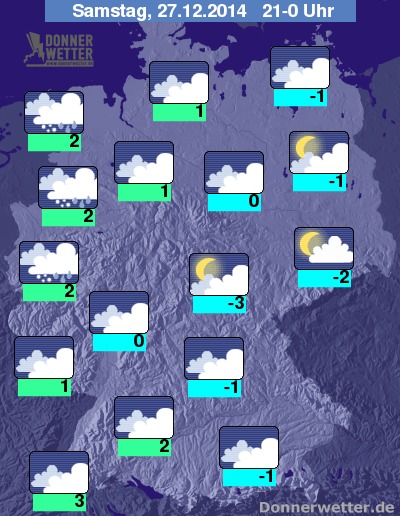 Frisch wird's zudem: Die Temperaturen liegen in der Nacht bei Werten um +3 °C im Breisgau und um -3 °C im Thüringer Wald.