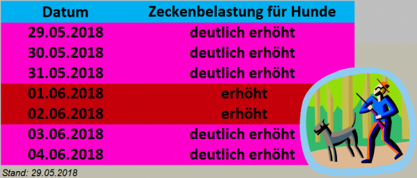 Warme feuchte Temperaturen sorgen für ein reges Treiben im Unetrholz. Die Zecken vermehren sich rasant und das Risiko für unsere Vierbeiner somit auch. Da die Wetterverhältnisse in den kommenden Tagen gleichbleibens sind, herrscht die ganze Woche erhöhtes Zeckenrisiko.