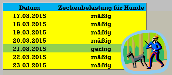 Aufgrund der milden Frühlingswitterung mit Temperaturen bis 15 Grad C tagsüber ist mit einer starken Zeckenaktivität im Flachland zu rechnen.