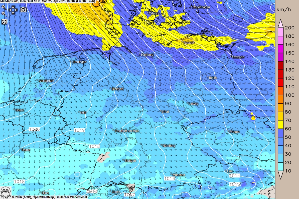 Ein schwacher bis mäßiger Nordwestwind begleitet uns über den Tag, wobei dieser im Norden und Nordosten stark auffrischt und an den Küsten sowie im angrenzenden Binnenland für stürmische Böen sorgt.