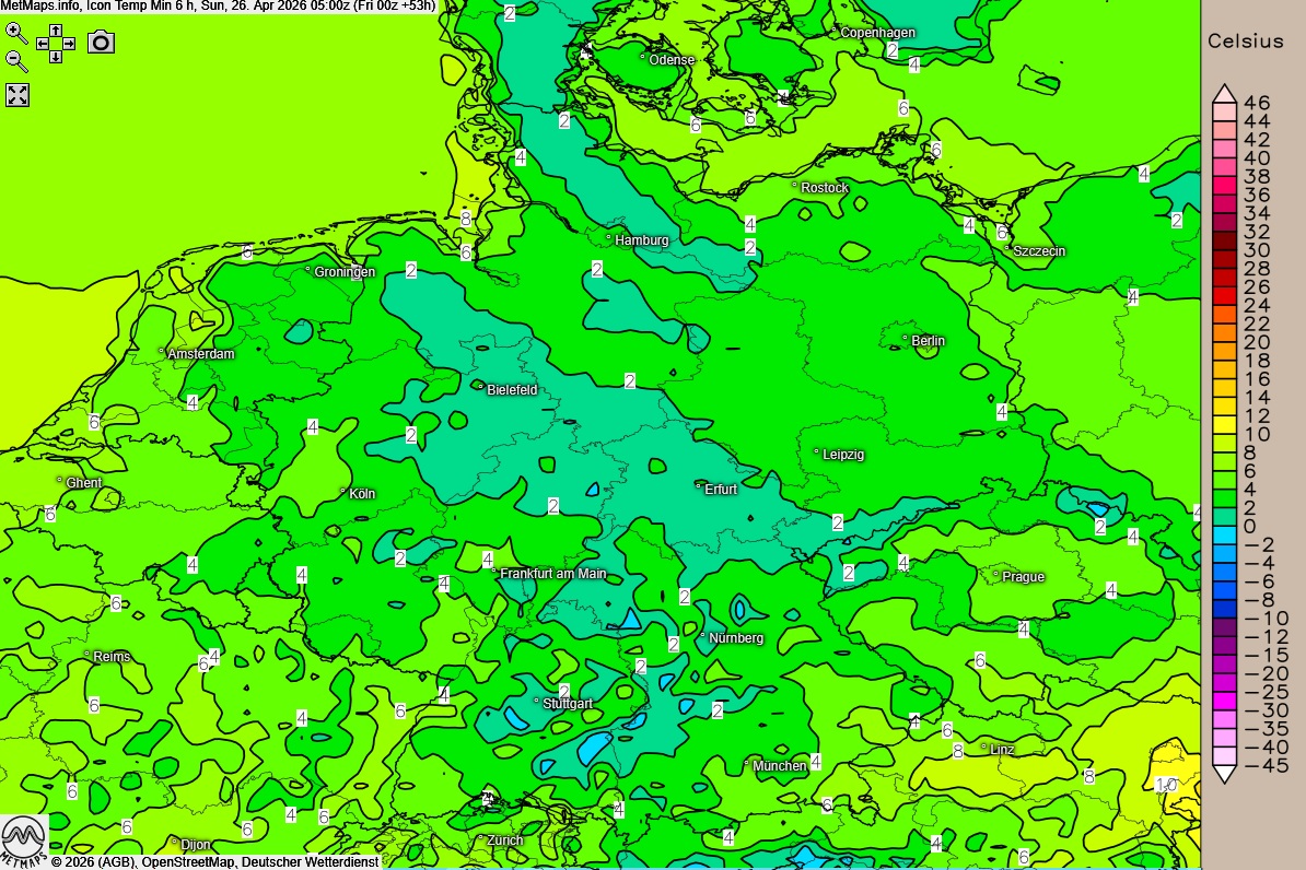 Dabei kühlt es auf 6 bis 0 Grad ab, was gebietsweise zu Frost in Bodennähe führt.