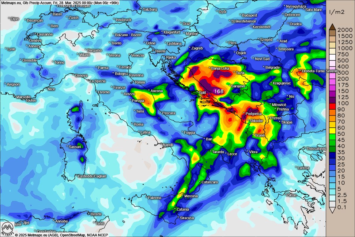 Mit Regenmengen bis zu 300 l/m² binnen 72 Stunden sind zunächst vor allem Kroatien, Serbien und Albanien betroffen; ab Mittwoch weiten sich die Niederschläge dann auch über allen anderen Balkanländern aus, eventuell auch über dem Norden Griechenlands.
