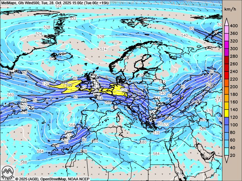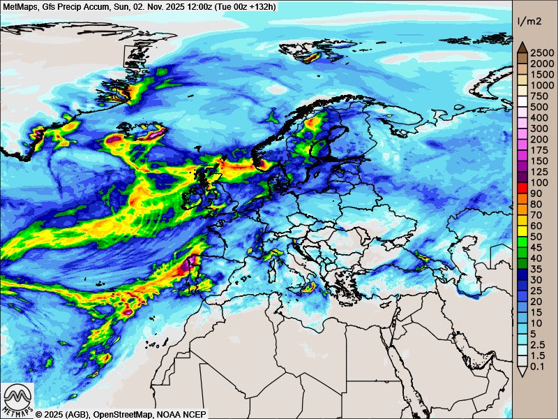 Die Höhenwindkarten (500 hPa) für den 28.10, 30.10. und 02.11. sowie die akkumulierten Regenmengen bis kommenden Sonntag (02.11.) nach GFS: