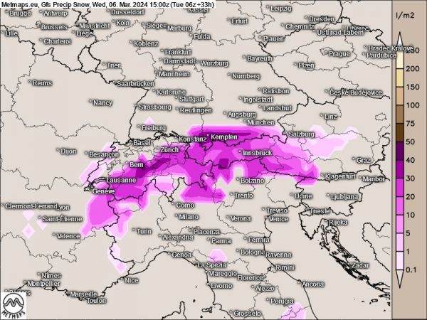 Nachdem vor allem der Norden Italiens in der letzten Woche von erheblichen Schneefällen heimgesucht wurde, gibt es nun auch für viele weitere Alpenregionen kräftigen Neuschneezuwachs: Am Mittwoch sind im gesamten Alpenraum Höhen von 30 bis 40 cm zu erwarten - besonders viel Schnee gibt es im Allgäu.