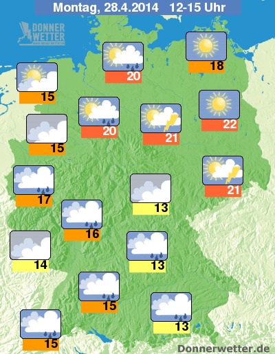 Die kommende kurze Woche fängt mit wechselhaftem Wetter in ganz Deutschland an. Im Südwesten fallen einige Schauer bei kühlen 15-18 Grad C. Im Nordosten ist es wärmer und sonniger mit 20 Grad C, allerdings fallen auch hier Schauer und teilweise sind auch Gewitter möglich. Dienstag und Mittwoch fallen weitere Schauer und es wird mit dem Mai trockener und kühler.