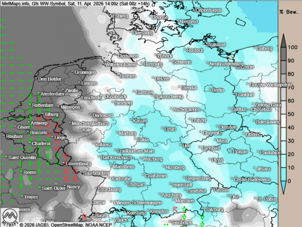 Für Euch hier die Cape-Lifted-Index-Karten für den Nachmittag und die Front nach Wettersymbolen (GFS). Allzu heftig wird das bei diesen geringen Cape-Werten nicht, aber ein Anfang ist gemacht.