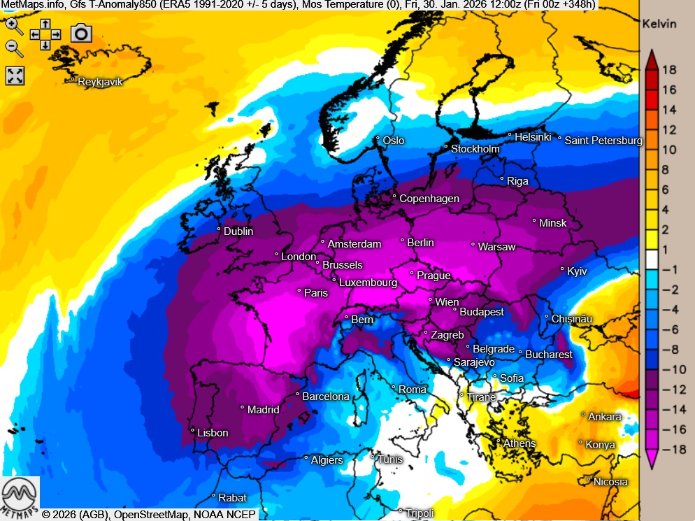 Die 850 hPa-Temperaturanomalie für Europa / Deutschland (30.01.) nach GFS: