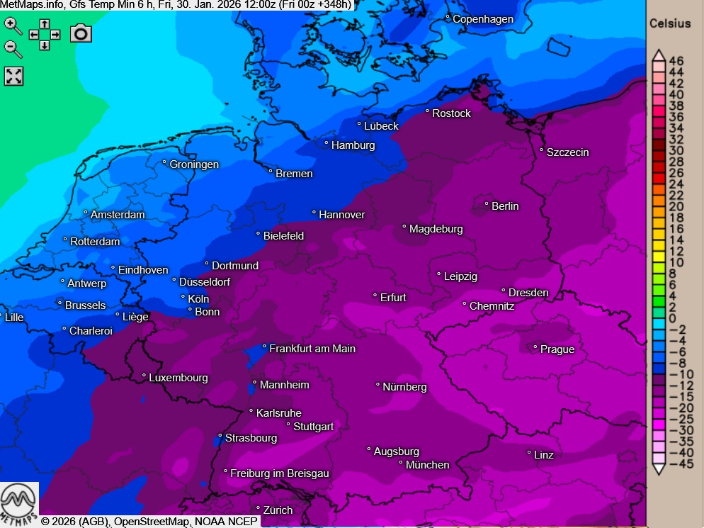 Zum direkten Vergleich hier die Temperaturminima für den 30.01.2026. Die erste Karte zeigt die Berechnung nach GFS, die zweite den ECMWF-Lauf: