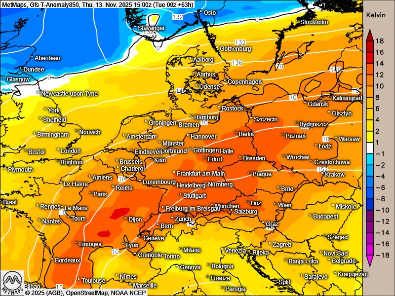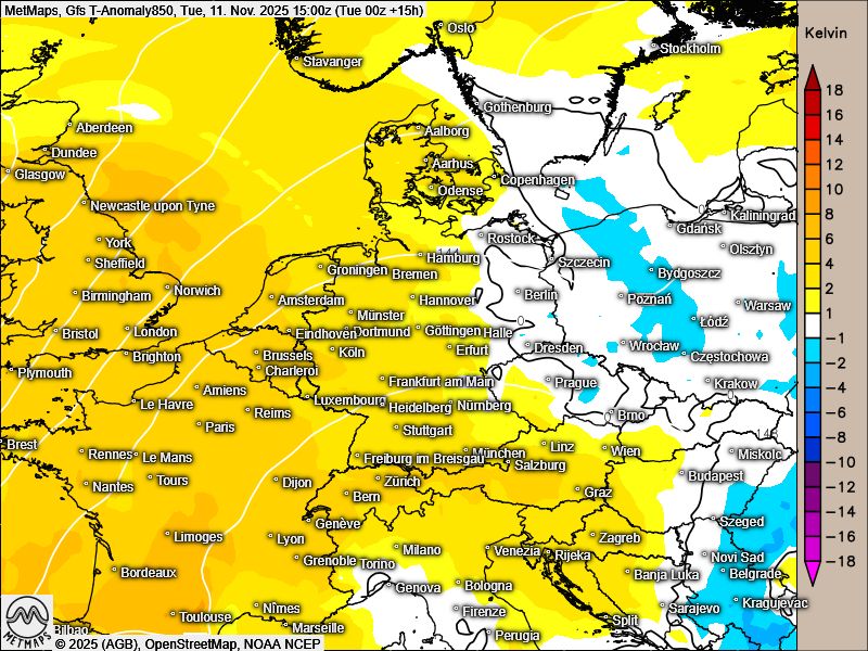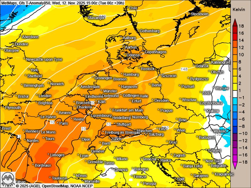 Eine starke Südwestdüse lässt die Temperaturen in Mitteleuropa nun ordentlich ansteigen: Bis Freitag werden für den November sehr milde 15 bis 19 Grad Lufttemperatur erwartet. Am Donnerstag liegen die Werte um 10 bis 15 Grad über den Normalwerten für diese Jahreszeit.