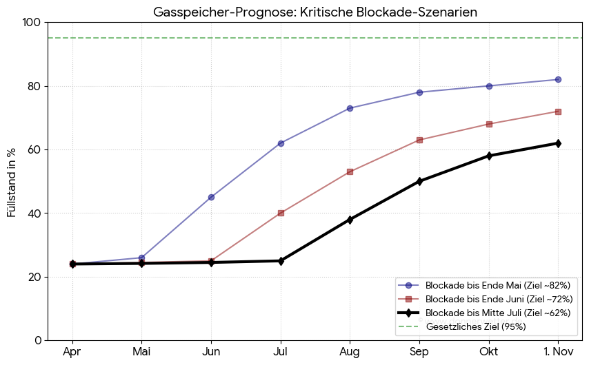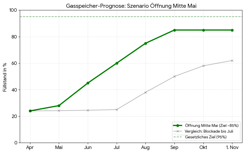 Ein entscheidender Indikator für die Versorgungssicherheit in Deutschland ist der Füllstand der Gasspeicher. Sollte die geplante Öffnung der Lieferwege und die Stabilisierung der Importe wie erwartet Mitte Mai eintreten, zeichnet sich ein positives Bild für die Bevorratung ab.