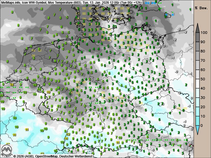 Die Wetter- und Temperaturkarte für Dienstagmittag (12:00 Uhr) nach ICON: