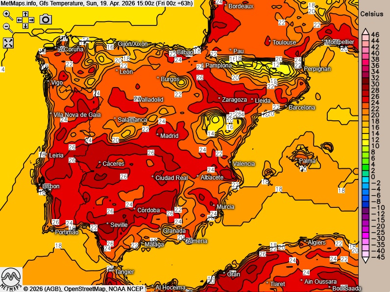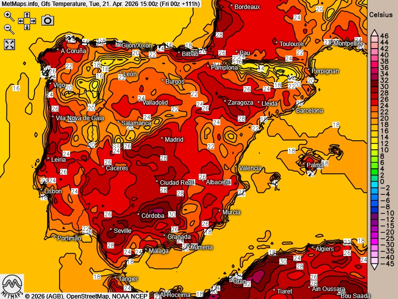 Die Lufttemperaturen in Spanien und Portugal am Sonntag- und Dienstagnachmittag (15:00 Uhr) nach GFS: