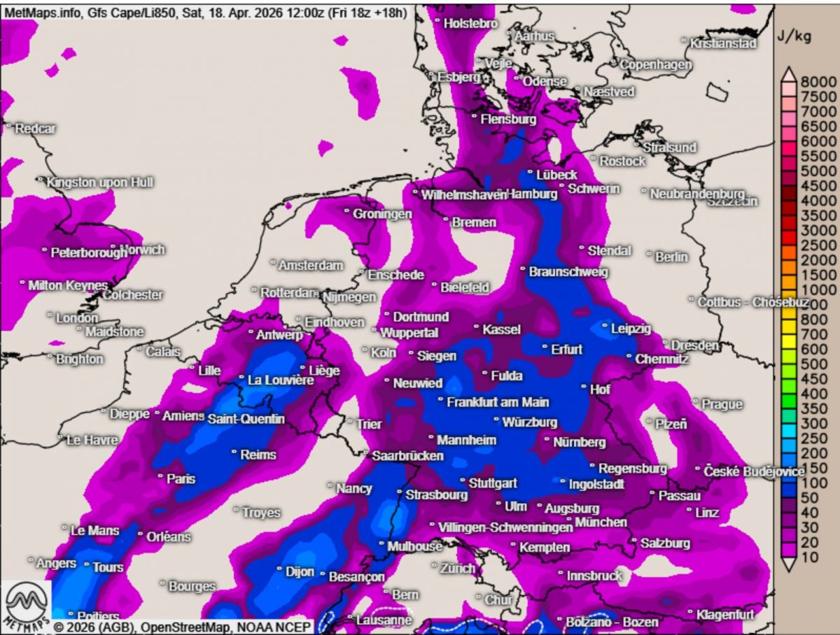 Die Cape/Lifted-Instabilitätskarte für 12:00 Uhr sowie die Wetterkarten für 15:00 und 18:00 Uhr nach GFS: