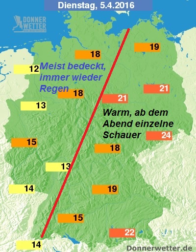 Westlich der Linie hält sich dagegen ein meist bedeckter Himmel, immer wieder fällt Regen. Mit Höchstwerten um 12 Grad C gehört der äußerste Nordwesten, etwa das Emsland, zu den heutigen Temperaturverlierern.