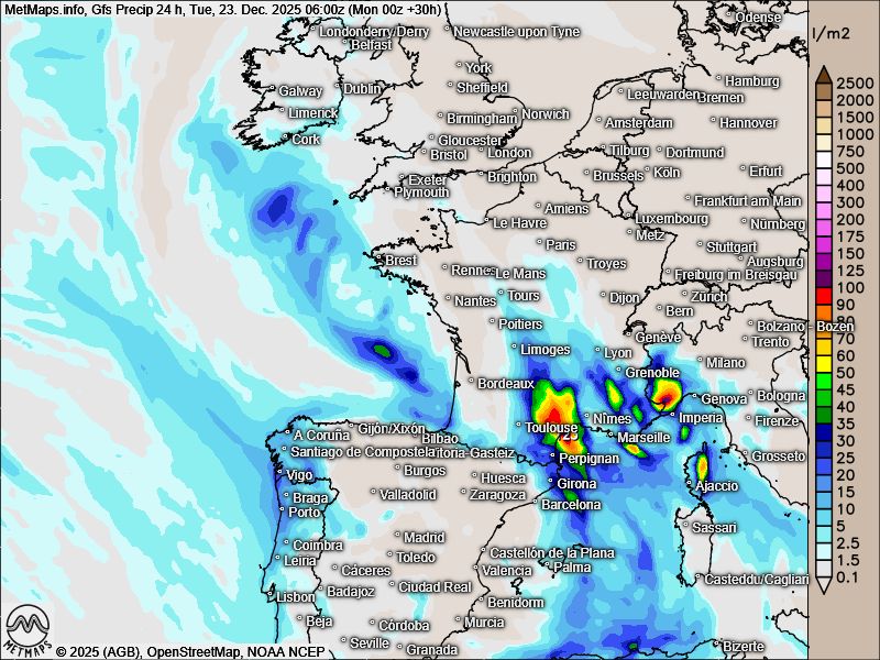 Zur Einordnung die GFS-Prognosen für den westlichen Mittelmeerraum - inklusive der erwarteten Niederschlagsmengen bis Dienstag sowie der Wetterlage am Dienstagmorgen.