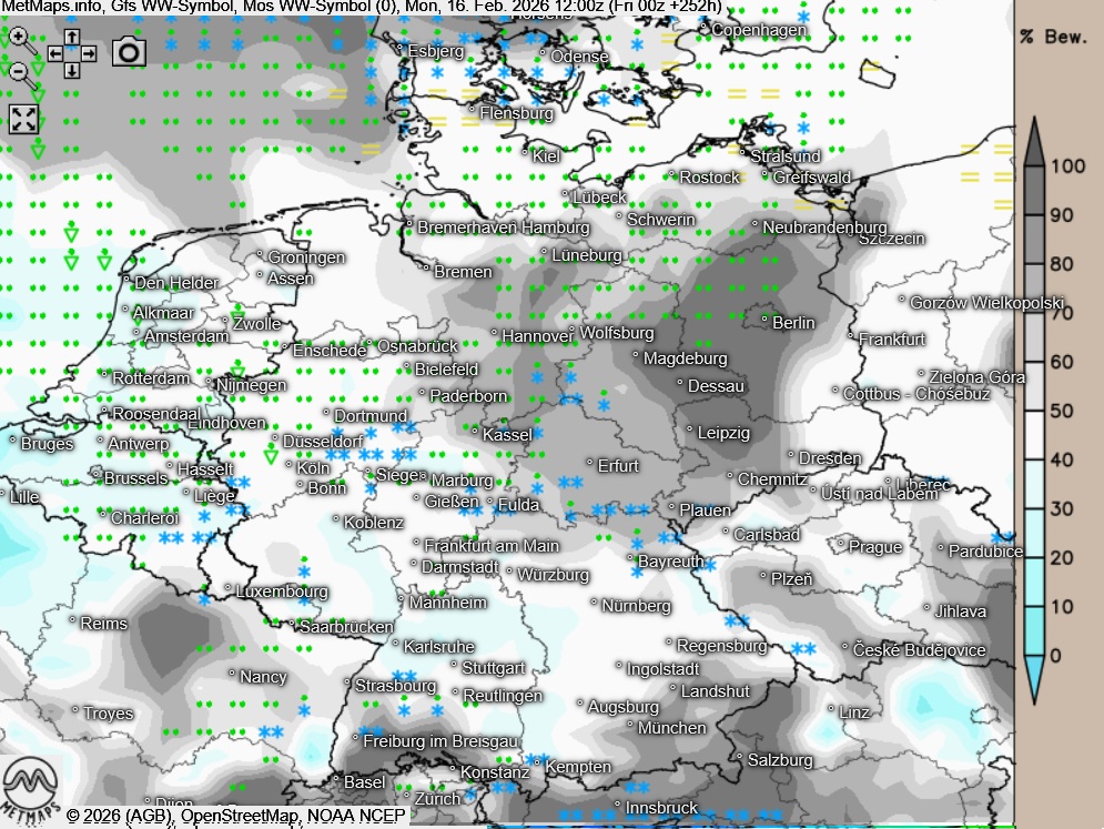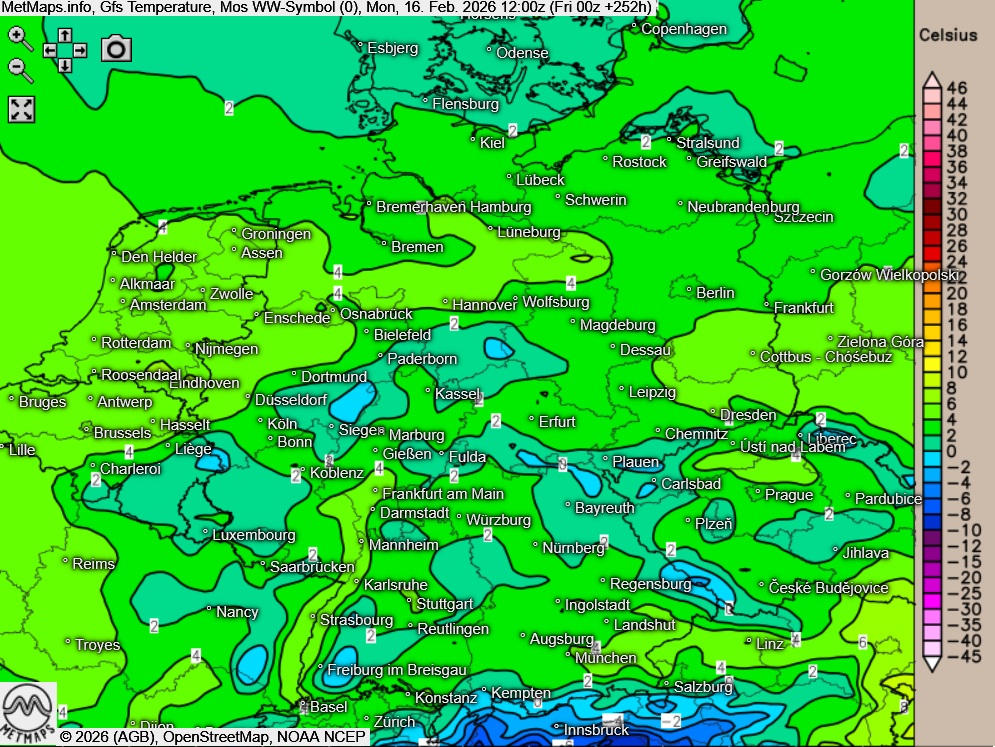 Die Wetter und Temperaturkarte für Rosenmontag nach GFS:
