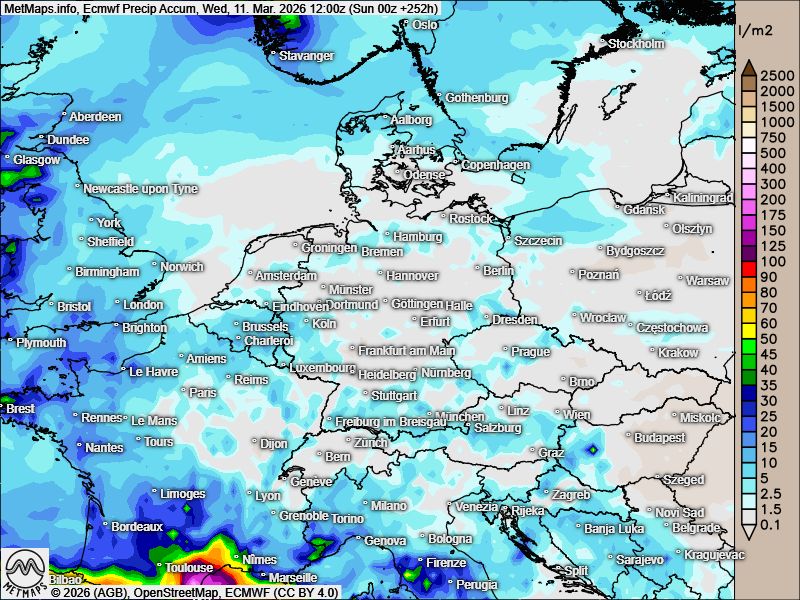 Die akkumulierten Niederschlagsmengen bis zum 10.03./ 11.03. nach GFS / ECMWF: