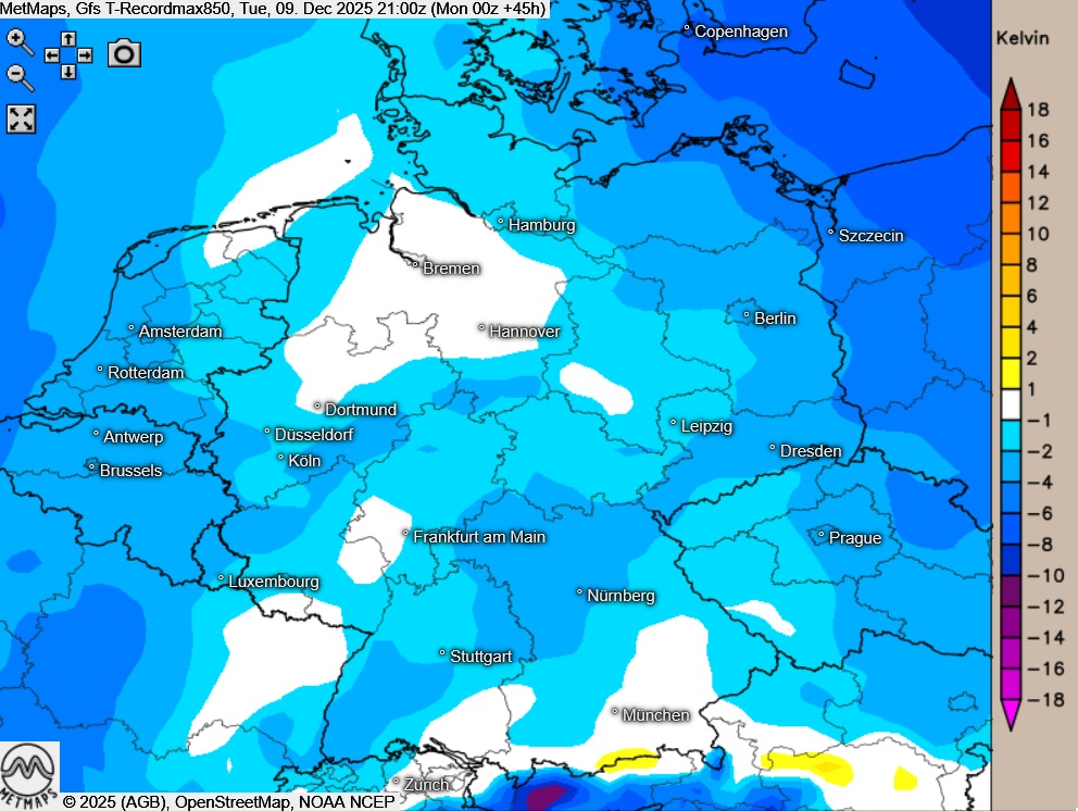 Die Lufttemperaturen für Dienstagmittag (13:00 Uhr) sowie die Abweichung von der Rekord-Maximaltemperatur (1.500 m Höhe) am Dienstagabend nach GFS: