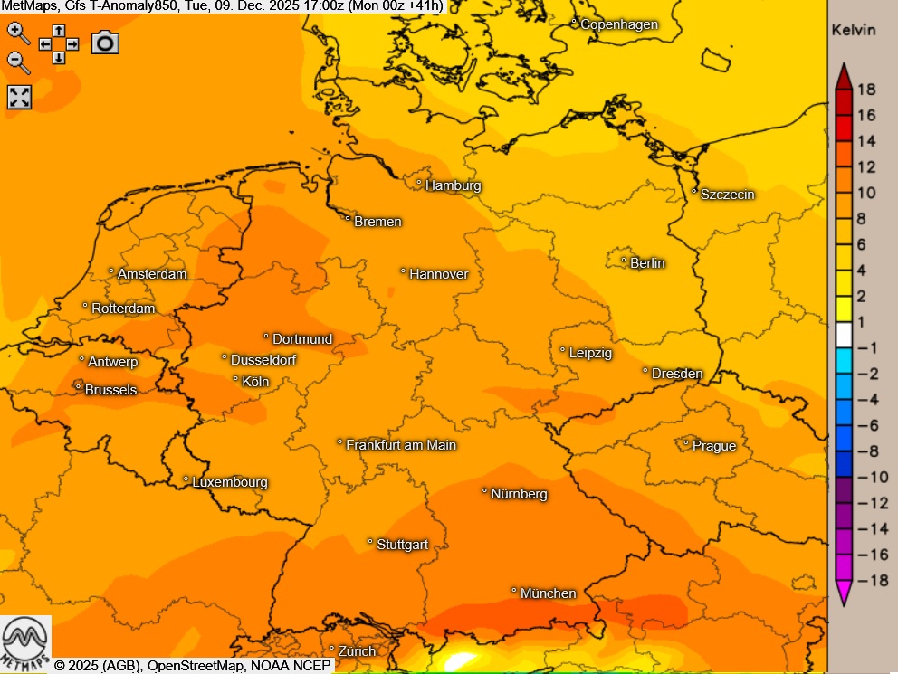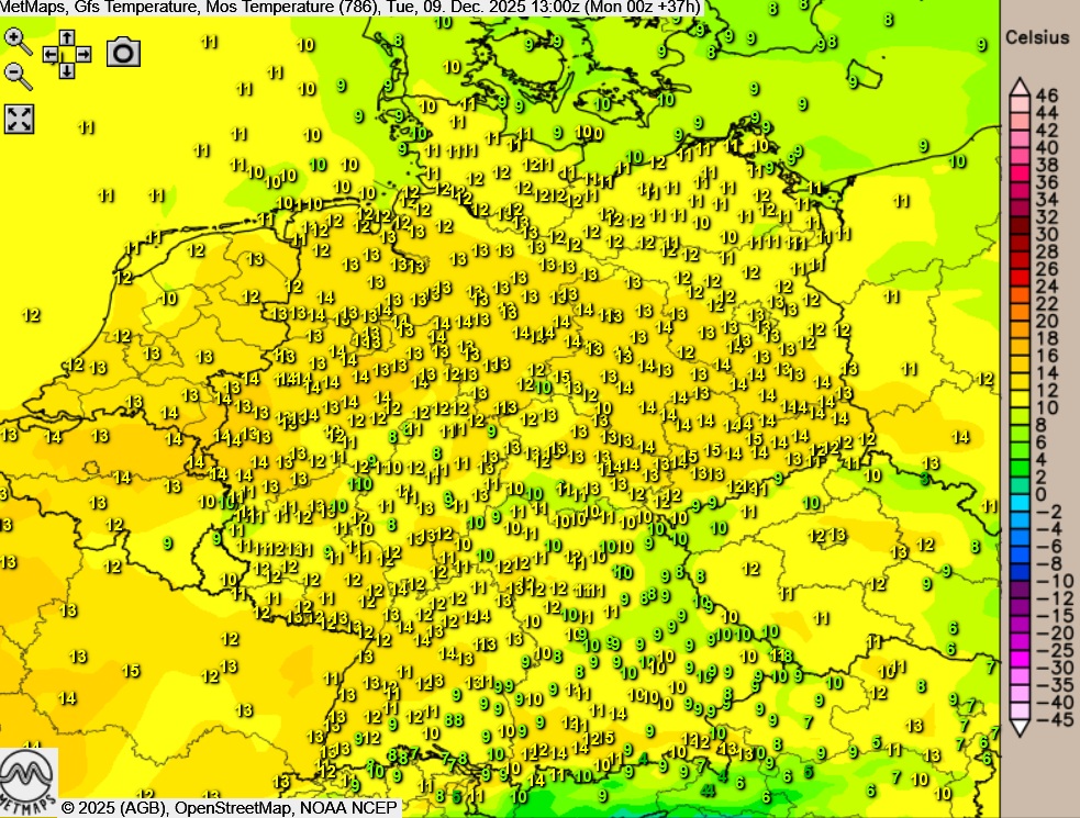 Nach aktuellem Stand bleibt die Wetterlage bis kurz vor Weihnachten weitgehend unverändert. Die Modelle zeigen anhaltende Westströmungen bis etwa zum 20. bis 22. Dezember. Zwar gehen die Werte bis dahin auch wieder etwas zurück, eine realistische Chance auf winterliche Verhältnisse gibt es aber allenfalls für die Höhenlagen der Mittelgebirge.