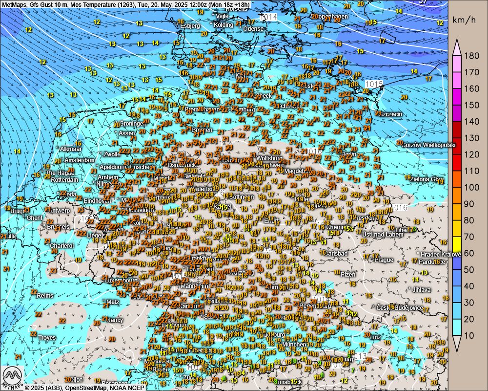 In den meisten Landesteilen hat der Dienstag heute deutlich höhere Temperaturen zu bieten. In der Bundeshauptstadt zeigt das Thermometer am Nachmittag Werte von 22/23 Grad, in Köln und Mainz ist mit bis zu 25 Grad ein Sommertag möglich. Eine Ausnahme: Direkt an der Nordsee bleibt es mit Wind von der See weiterhin frisch. In Teilen Norddeutschlands sowie im äußersten Süden sind im Tagesverlauf zudem einzelne Schauer unterwegs.