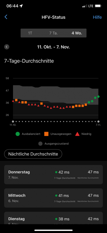 Nach Überstehen des Infektes gab der Sensor kurz darauf sprichwörtlich "grünes Licht". Mit dem Hinweis eines ausgewogenen HRV-Status (Grafik rechts) konnte so auch wieder bedenkenlos das Training fortgesetzt werden.