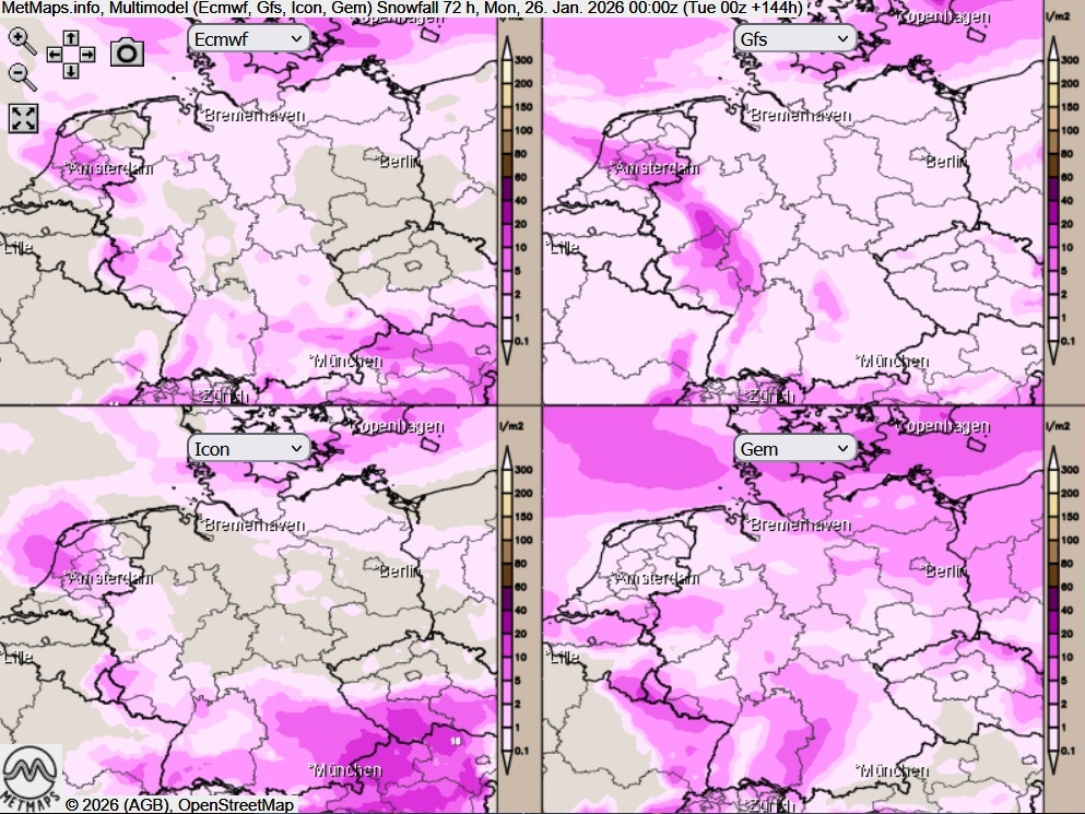 Die 72-Stunden-Schneemengen bis kommenden Montag (00:00 Uhr) in der Multimodell-Prognose sowie die Wetter- / Temperaturkarte für Montag (12:00 Uhr) nach GFS: