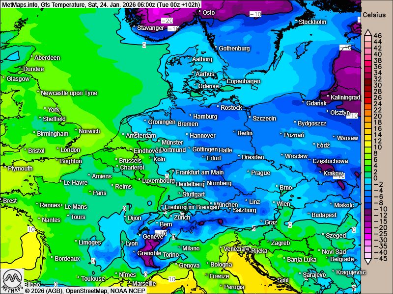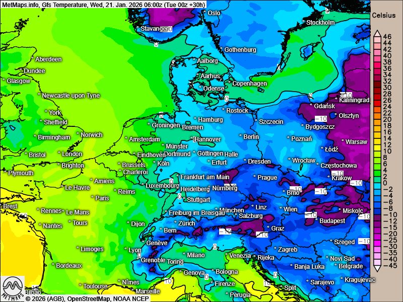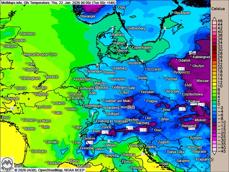 Nachfolgende eine Abfolge der Frühtemperaturen bis zum Wochenende nach GFS - hier deutlich zu sehen ist der Rückgang der Temperaturen. Nur der äußerste Westen bleibt bei Lufttemperaturen um 0 Grad C im Einfluss milder atlantischer Luftmassen.