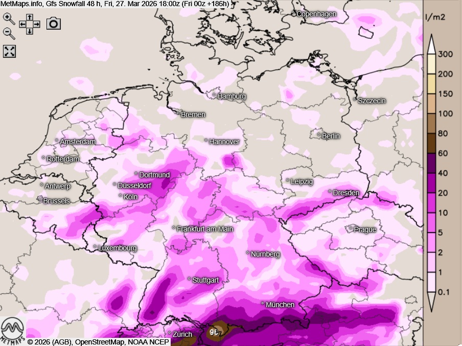 Die akkumulierten 48-Stunden-Schneemengen bis 27.03.2026 (18:00 Uhr) nach GFS: