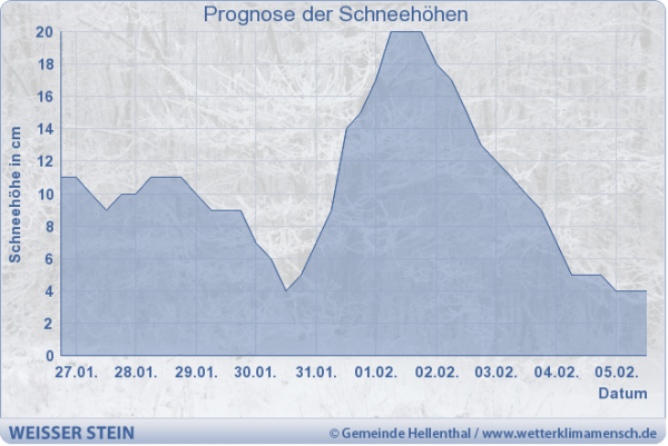 Der Weiße Stein in der Eifel (650 m, Schneeprognose in der Grafik unten) kommt aktuell noch auf eine Schneehöhe von 13 cm. Der Brocken (Harz) verzeichnet aktuell Schneehöhen um 11 cm, auf dem Feldberg (Schwarzwald) sind es sogar 63 cm.