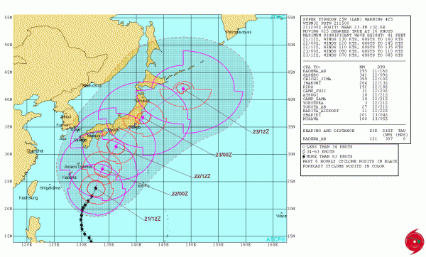 Am Sonntag wird in Japan gewählt. Erste Ausläufer des Typhoon Lan werden dann schon Regen und Sturm in Japan bringen. In der Nacht zu Montag und am Montag zieht dann dieser schwere Typhoon über Japan hinweg. Es trifft ausgerechnet auch Tokio. Es ist mit erheblichen Auswirkungen und mit steigenden Risiken, auch für die zahlreichen Nuklearanlagen im Land zu rechnen. Bis zu 50 Mio Menschen betroffen und gefährdet.