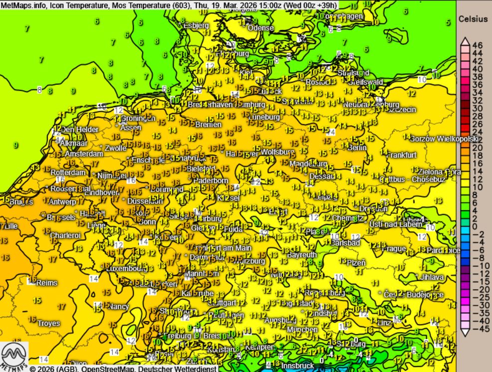 Allerdings macht sich regional ein teils kräftiger Ostwind bemerkbar: Besonders in der Mitte Deutschlands sowie in den südlichen Mittelgebirgen kann dieser zeitweise böig auffrischen. Die Temperaturen steigen am Donnerstag auf milde 14 bis 18 Grad Celsius.