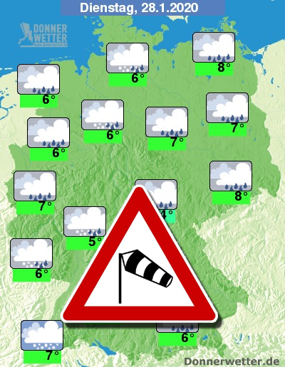 Im Flachland sind vor und in Schauern Sturmböen, eventuell auch schwere Sturmböen möglich. In den Mittelgebirgen gibt es verbreiteter schwere Sturmböen, in Kammlagen des Schwarzwaldes und in den Alpen sind auch orkanartige Böen möglich.
