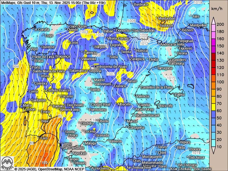 Die Böenkarte für Donnerstagnachmittag sowie die 48-Stunden-Regenmengen bis Samstagfrüh für Spanien/Portugal nach GFS: