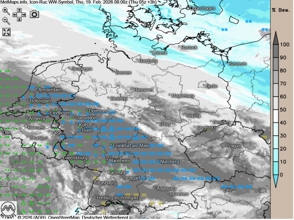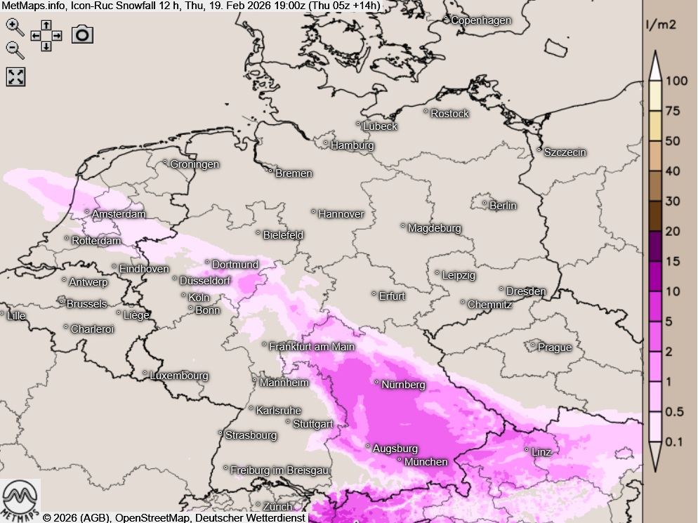 Die Wetterkarte für 08:00 Uhr sowie die 12-Stunden-Schneemengen bis 19:00 Uhr nach ICON-RUC: