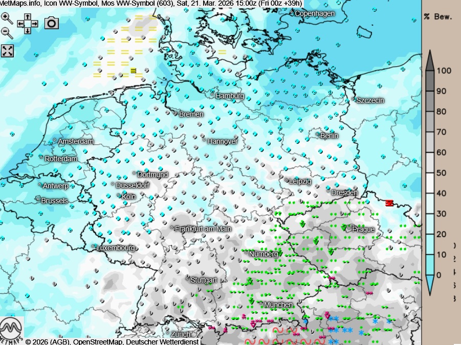 Ein Kaltlufttropfen verpasst den Lufttemperaturen am Nachmittag vor allem im Südosten Deutschlands einen deutlichen Dämpfer: Gebietsweise ist es hier bei dichten Wolken und etwas Regen sechs Grad kälter als noch am Freitag.
