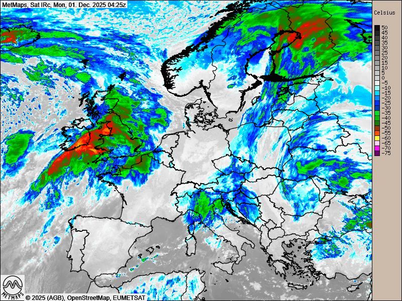 Das IR-Sat-Bild von Montagfrüh, die Höhenwindkarte für Dienstagfrüh sowie die Wetterkarten für Dienstagnachmittag und Mittwochfrüh nach GFS: