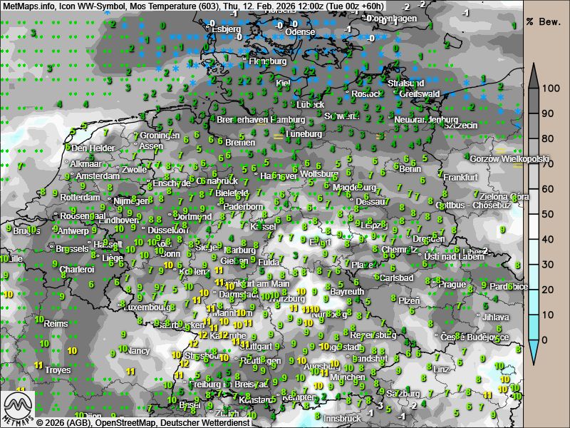 An Weiberfastnacht präsentiert sich das Wetter bundesweit überwiegend grau und nass. Schneefall beschränkt sich nur noch auf die Küstenregionen an Nord- und Ostsee.