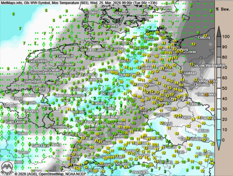 Begleitet wird der Wetterumschwung von einem markanten Temperaturrückgang. Bei anhaltendem Schauerwetter gehen die Werte spürbar zurück und erreichen teils nur noch etwa die Hälfte des zuvor gemessenen Niveaus. In der Nacht zum Donnerstag fällt ab 400 m der erste Schnee.