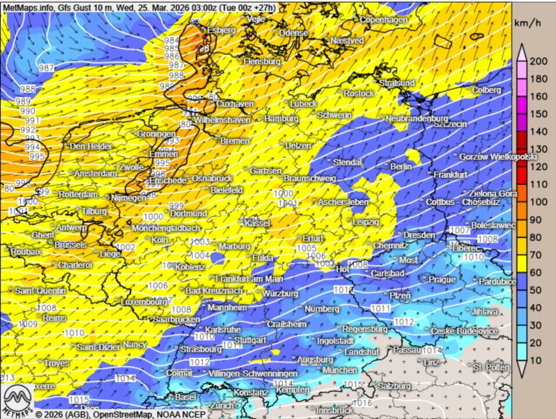 Die Böenkarten für Mittwoch (00:00 / 03:00 Uhr) sowie die Wetterkarte für 09:00 Uhr nach GFS: