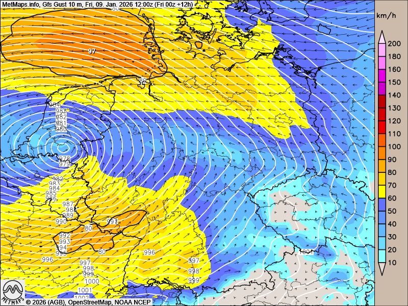Die Böenkarte für Freitagmittag, die Sechs-Stunden-Schneemengen bis Freitagmittag sowie die Sechs-Stunden-Schneemengen bis Samstagfrüh nach GFS: