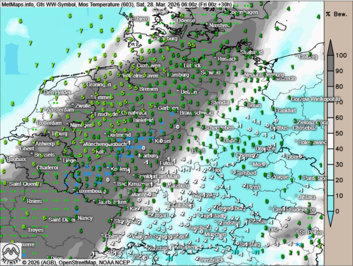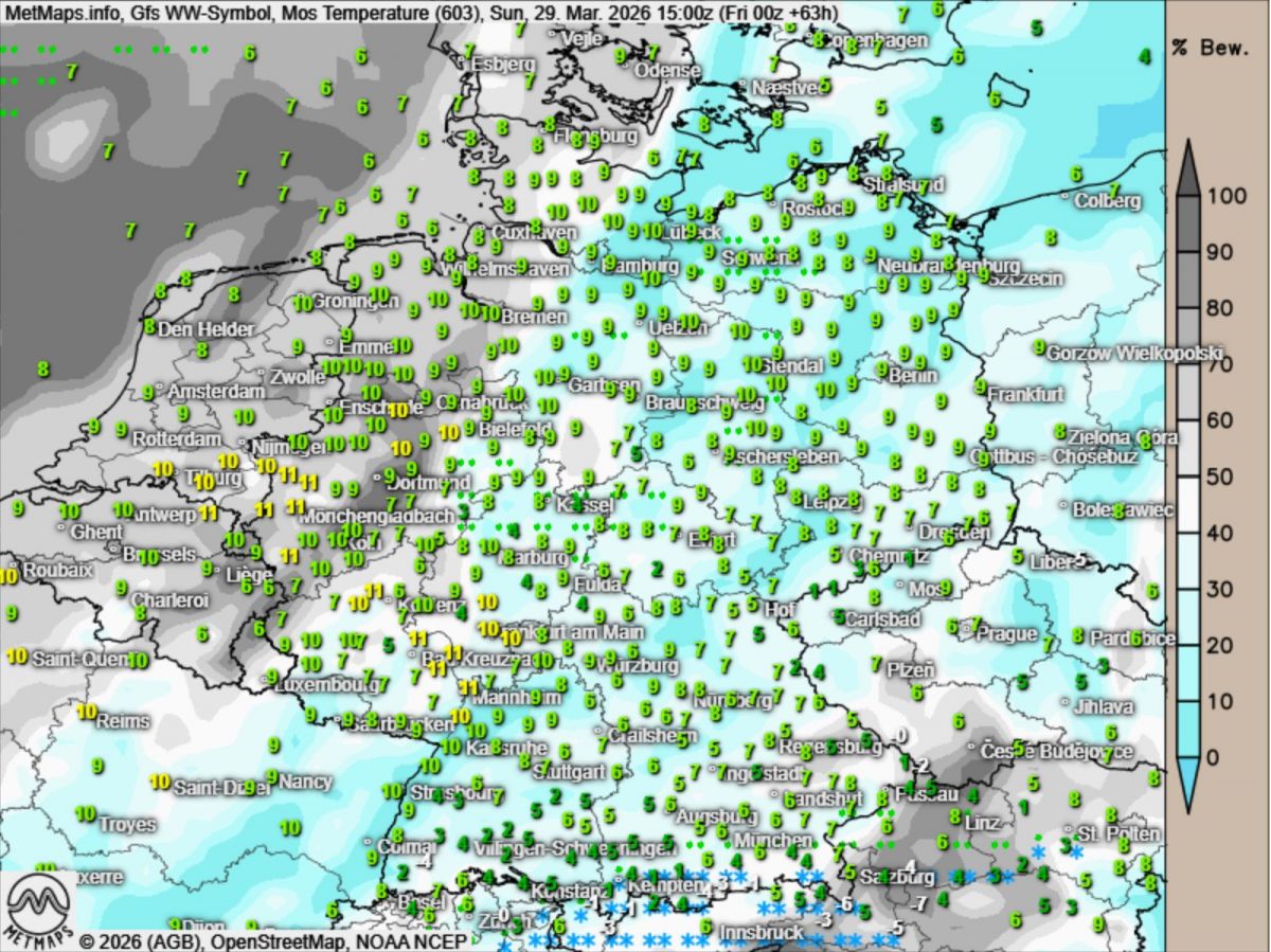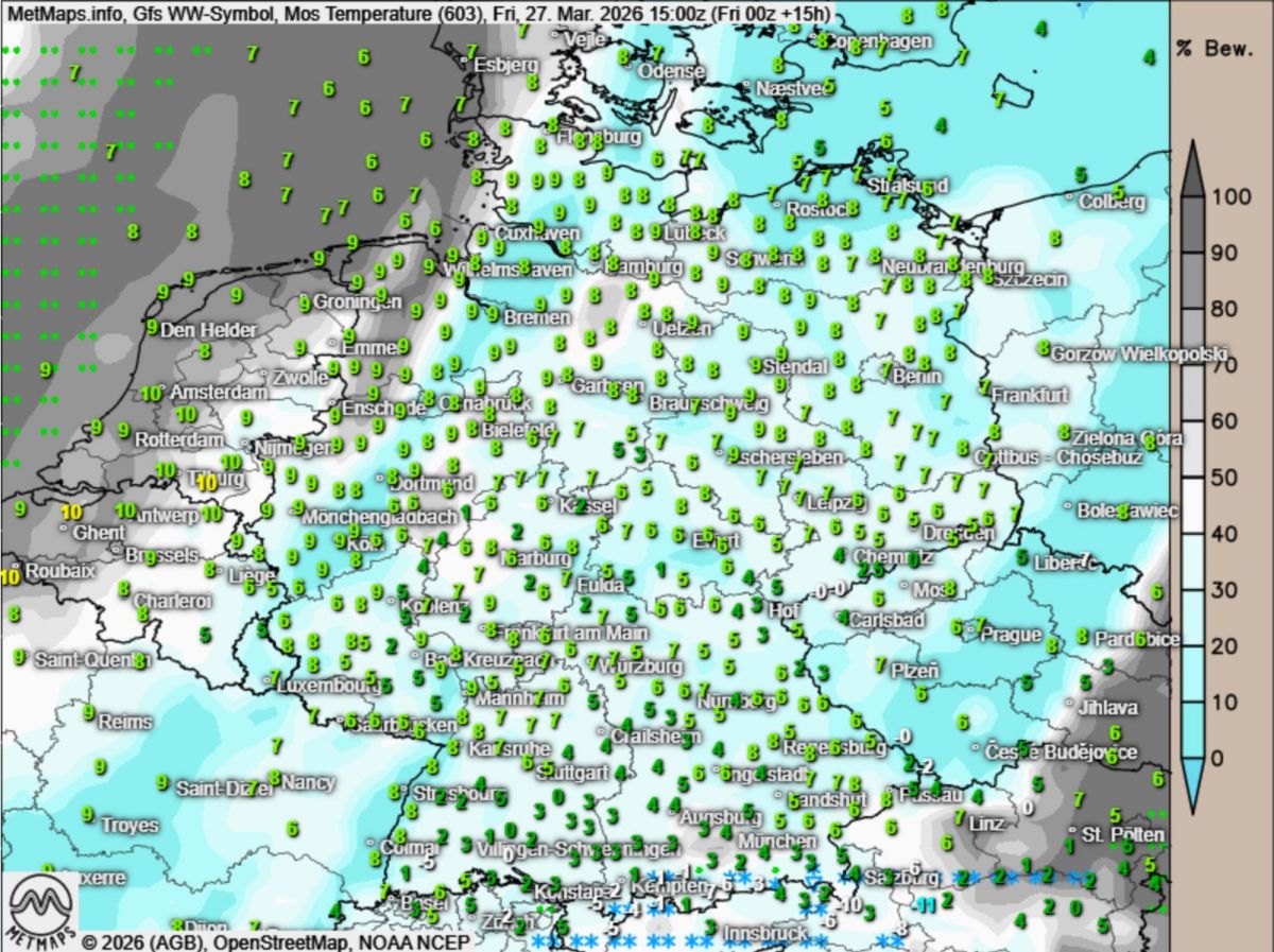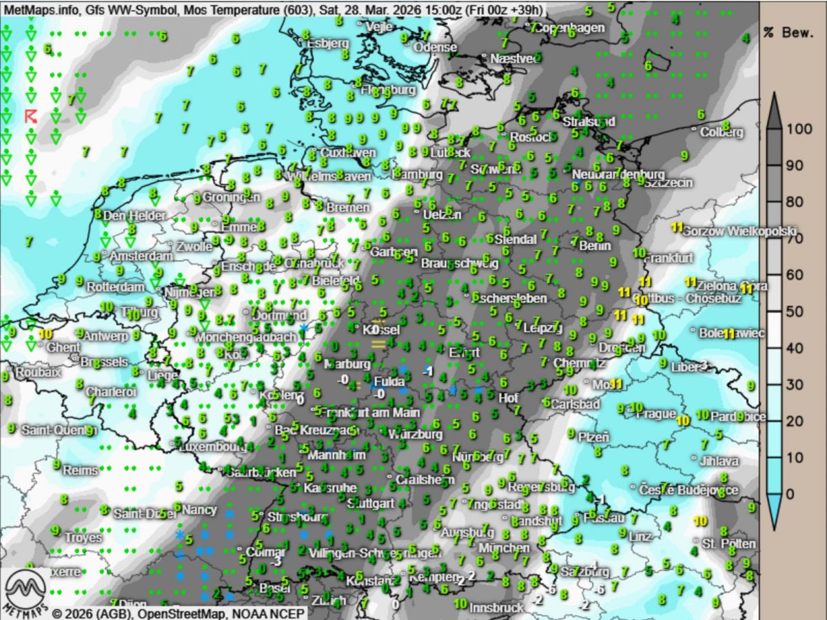 Die Wetter und Temperaturkarten für Freitag (15:00 Uhr), Samstag (06:00 und 15:00 Uhr) sowie Sonntag (15:00 Uhr) nach GFS: