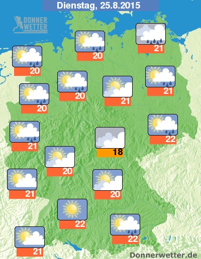 Am Dienstag, zeigt das Wetter sich im Süden meist heiter. In Oberbayern sind mit Regenfällen zu rechnen. In der Nordlichen Hälfte der Republik besonders in den Gebiten an der Ostseeküste und in Niedersachsen sind mit hoher warscheinlichkeit Regenschauer garantiert. Selten zeigt sich auch om Osten Deutschlands die Sonne, wo auch überwiegend Regen angesagt ist.