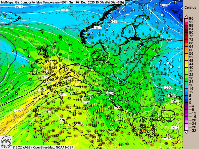 Die Strömungs- / Temperaturkarte Europa für Sonntagnachmittag sowie die GFS-Wetterkarten-Plots bis Sonntag:
