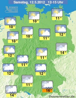 Von Freitag auf Samstag breitet sich von Nordwesten kältere Luft aus. Die kalte Luft schiebt sich unter die warmen Luftmassen und löst teilweise kräftige Schauer und Gewitter aus. Am Samstag Nachmittag wird sich die kältere Luft schon über fast über ganz Deutschland ausgebreitet haben, das Wetter beruhigt sich, nur noch einzelne Schauer folgen. Die Temperaturen liegen verbreitet nur noch um 10 bis 12 Grad C.
